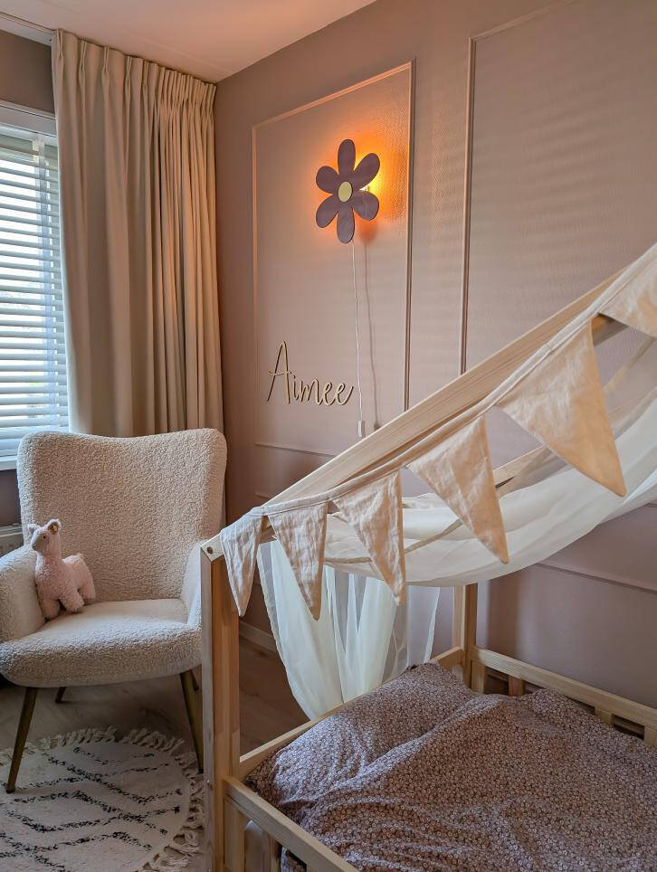 De basis van een knusse kamer begint met kleuren. Kies voor zachte, natuurlijke tinten zoals pastelkleuren, warm beige of aardetinten. Deze kleuren zorgen voor rust en warmte. Voeg contrast toe met vrolijke accenten. Dit zou je kunnen doen door decoratie voor de kinderkamer toe te voegen zoals een gekleurde naamslinger. Kies hierbij zelf de kleur en de naam of eventueel leuke figuren die passen bij de rest van je kamertje.