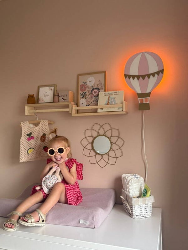 Deze houten Luchtballon wandlamp past geweldig op iedere babykamer of kinderkamer! Het leuke aan deze wandlamp is dat deze in oneindig veel kleurcombinaties mogelijk is! Perfect voor de kamers met een wolken thema of luchtballonnen thema. Onze wandlamp is ideaal te gebruiken als nachtlampje, leeslampje of als je er 's nachts uit moet om je kind te voeden.