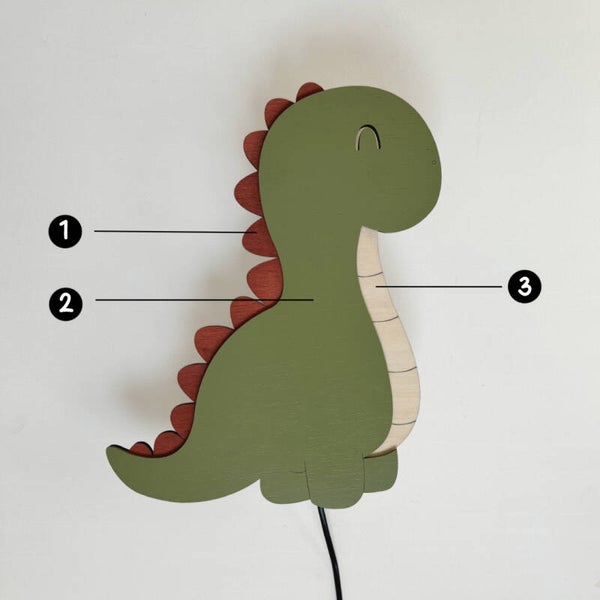 Deze houten Dino wandlamp past geweldig op iedere babykamer of kinderkamer! Het leuke van deze lamp is dat deze in oneindig veel kleurcombinaties mogelijk is, zelfs een roze dino voor de stoere meisjes kamer is mogelijk! Onze wandlamp is ideaal te gebruiken als nachtlampje, leeslampje of als je er 's nachts uit moet om je kind te voeden.