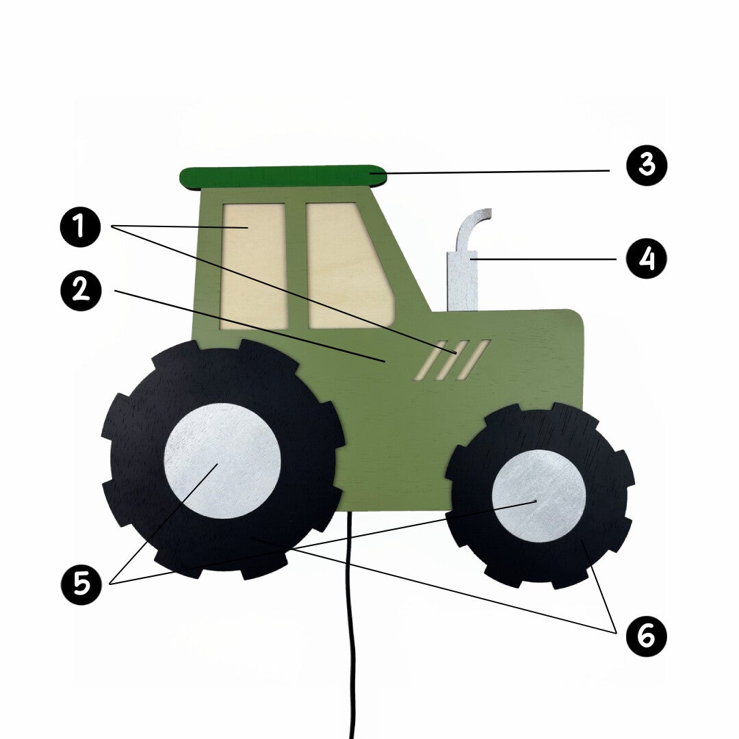 Deze houten Tractor wandlamp past geweldig op iedere babykamer of kinderkamer! Het leuke aan deze wandlamp is dat deze in oneindig veel kleurcombinaties mogelijk is! Perfect voor de kamers met een boerderij thema. Onze wandlamp is ideaal te gebruiken als nachtlampje, leeslampje of als je er 's nachts uit moet om je kind te voeden.