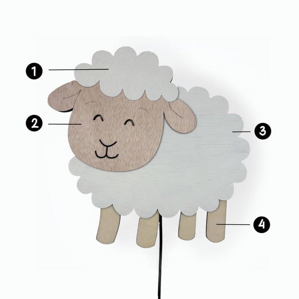 Dit houten schaap wandlampje past geweldig op iedere babykamer of kinderkamer! Het leuke aan deze wandlamp is dat deze in oneindig veel kleurcombinaties mogelijk is! Perfect voor de kamers met een boerderij thema. Onze wandlamp is ideaal te gebruiken als nachtlampje, leeslampje of als je er 's nachts uit moet om je kind te voeden.